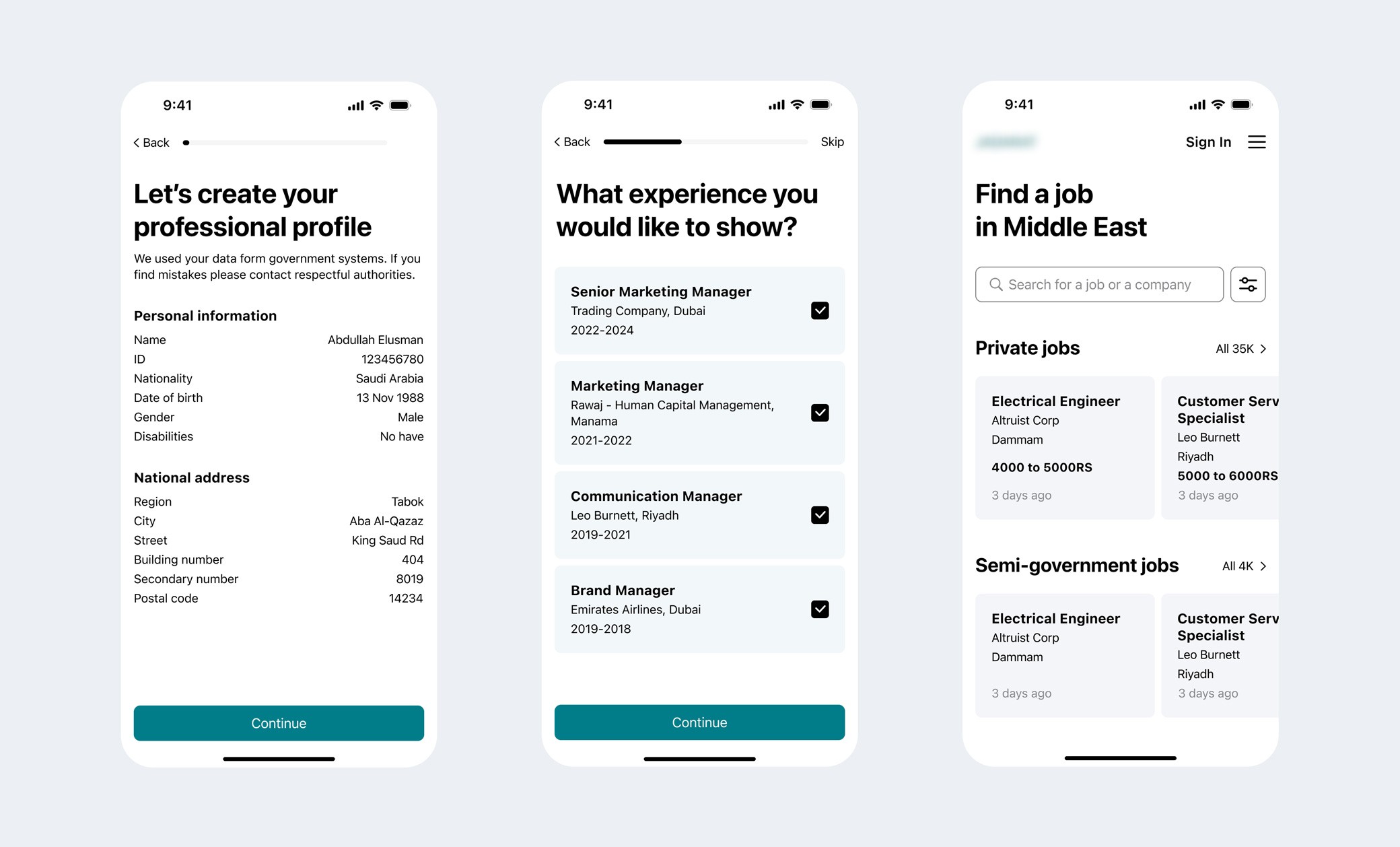 To build a user-driven strategy we conducted quantitative research. Interviews were organized to gather insights from job seekers and employers. We segmented people by age, gender, work experience, and type of companies (public, private and semi-government). Also, they were separated by experience in Jadarta and without. This research provided valuable data on user behaviours, expectations, and challenges in the Saudi job market.
