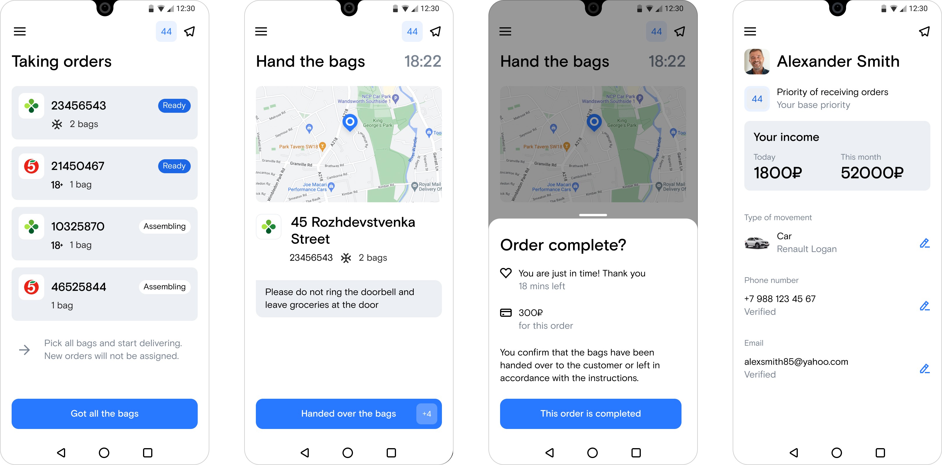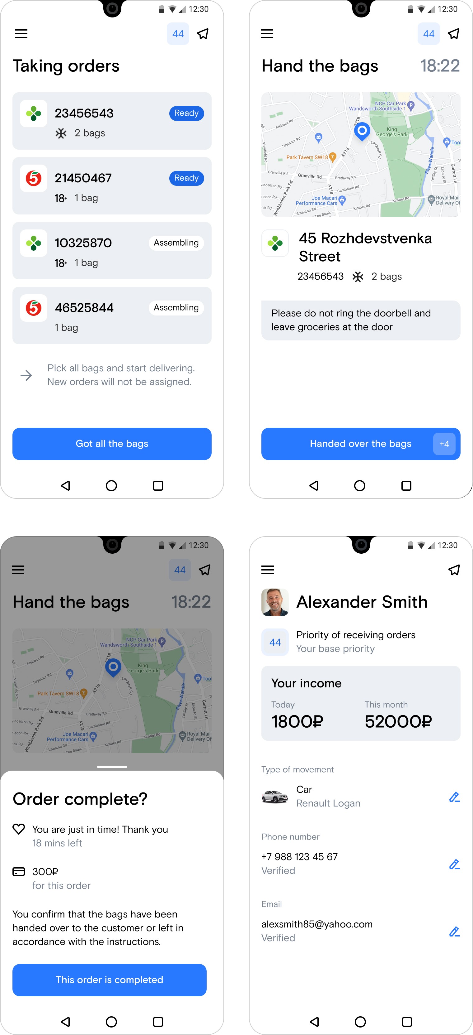 The app breaks down a courier's workflow into a few basic steps. Each stage is a clear list of tasks that need to be completed. Lightweight UI with visual focus on critical actions: buttons, map widgets, statuses. The main idea is to motivate couriers to do their best without putting too much pressure on them. It should be easy to understand and navigate, simple, not intrusive, and speak the same language as the couriers.